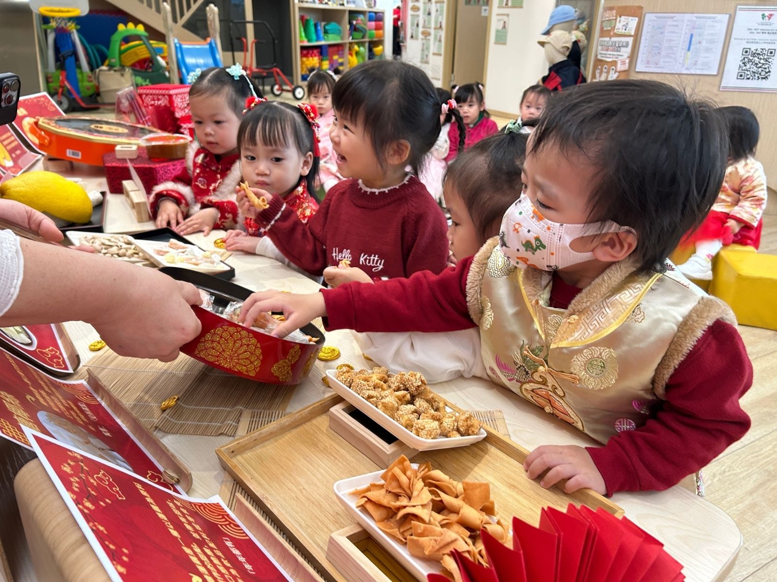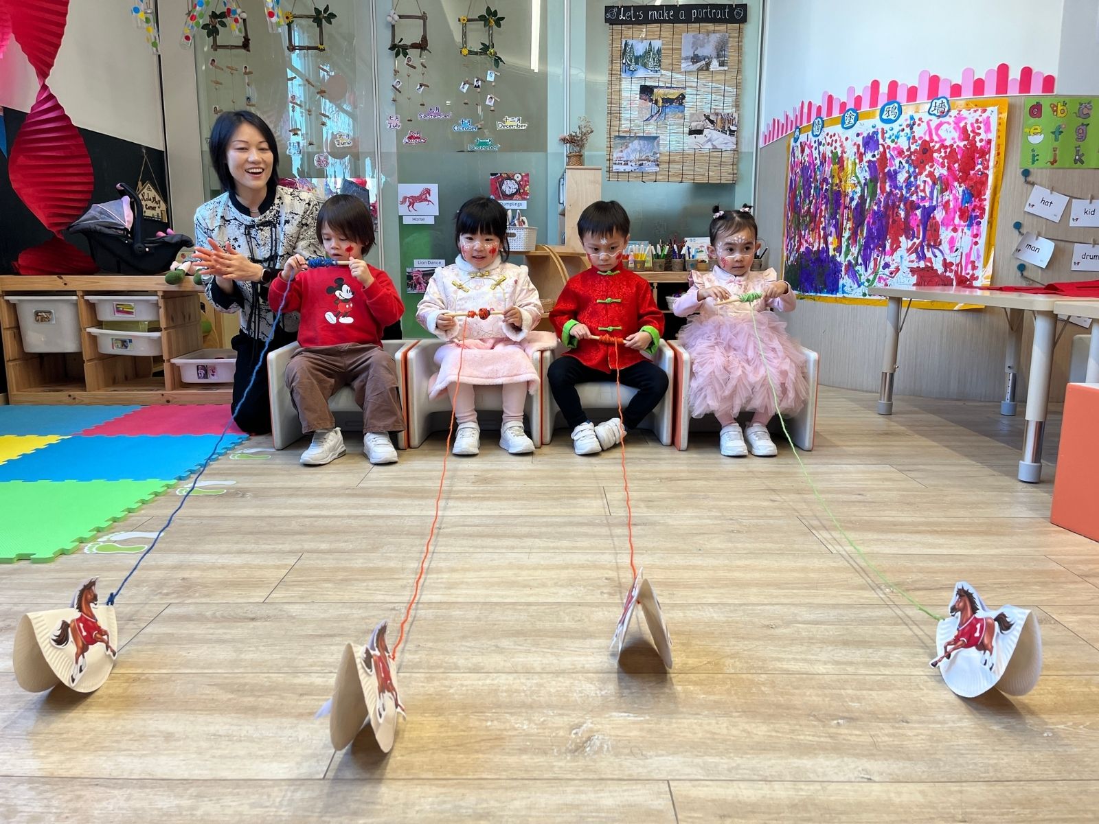 This year is the Year of the Horse, and the children enjoyed a festive mix of tradition and creativity. During the "Decorating with Lanterns and Ornaments" activity, they added colorful decorations to their classrooms. The 'Galloping Horses' game had everyone cheering as they raced their "horses". In 'Gathering Blessings,' children competed to collect the most fortune using 'sticky palm' toys.
